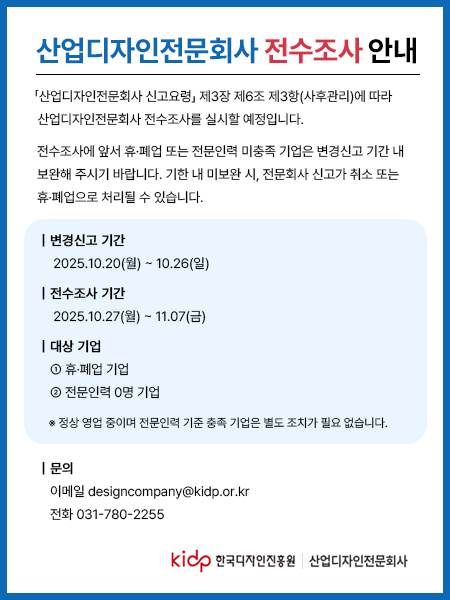 이메일(designcompany@kidp.or.kr) 발송을 통하여 전문인력 삭제를 요청해주세요.